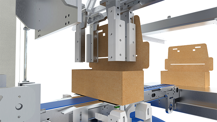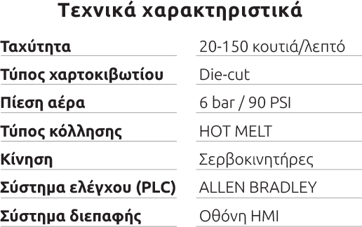 Αυτόματη μηχανή εισαγωγής προϊόντων μέσα σε κουτί. Διατίθενται εκδόσεις συνεχούς ή βηματικής κίνησης αναλόγως της επιθυμητής παραγωγικότητας. Η μηχανή οδηγεί τα προϊόντα στο σταθμό εισαγωγής τους στα προ διαμορφωμένα κουτιά. Μέσω πνευματικών ωστηρίων τα προϊόντα εισάγονται στο κουτί, τα οποία στη συνέχεια σφραγίζονται με κόλληση hot melt. Αντικαθιστούν τα κουτιά tuck in μειώνοντας σημαντικά το κόστος αναλωσίμου.
